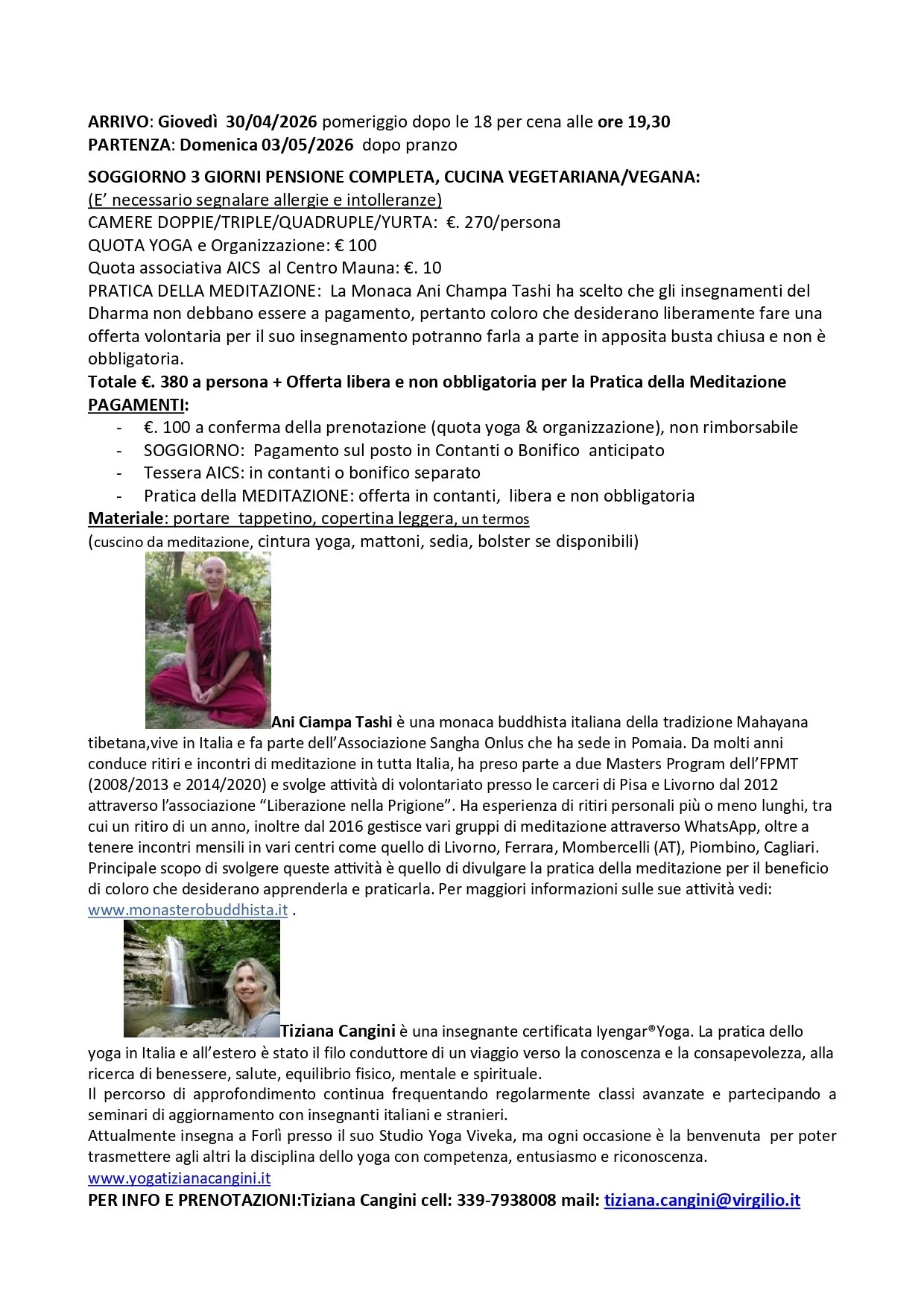 PER INFO E PRENOTAZIONI:Tiziana Cangini cell: 339-7938008 mail: tiziana.cangini@virgilio.it